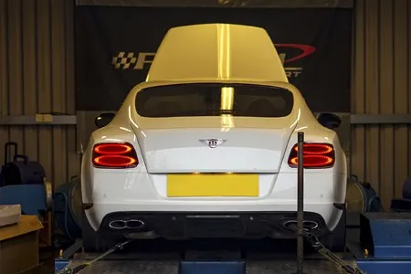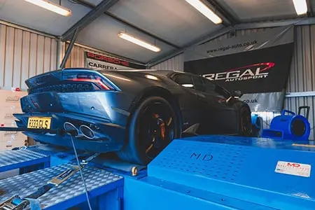 The Regal Autosport Rolling Road is a a Mustang MD-500 AWD dyno with custom TAT software. The Mustang MD-500 AWD dyno is a mechanically linked strain gauge type dynamic load cell dyno. The way it measures power is that it applies a variable load on the primary mover (in this case the drums) and measures the PM’s ability to move this. The TAT software then records this and finally calculates the output based on the measurement plus the strain gauge/load cell and the speed sensor.